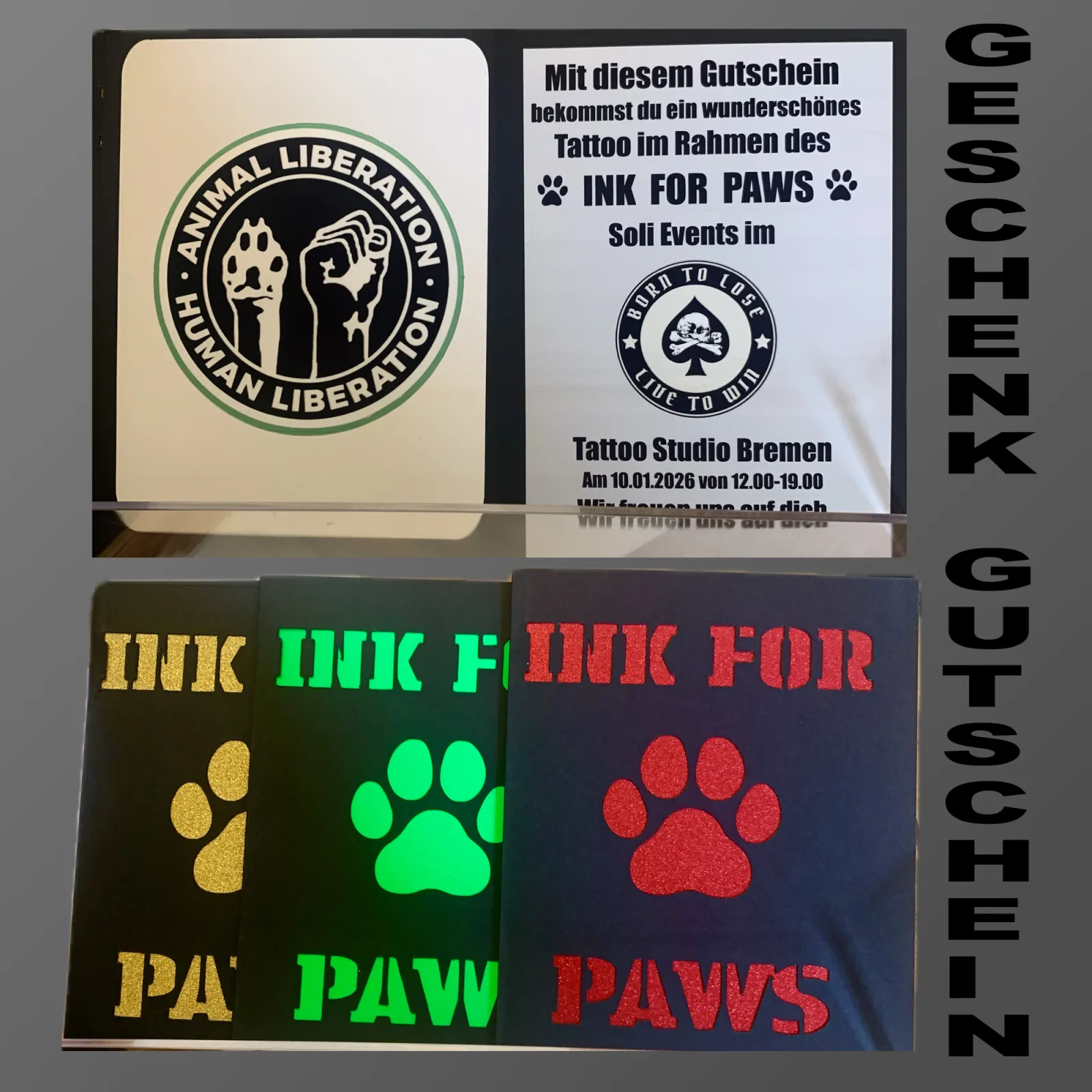 Du kannst diesen Event auch als wunderschönen Geschenk Gutschein unter dem Motto INK FOR PAWS ab sofort im Studio erwerben.
